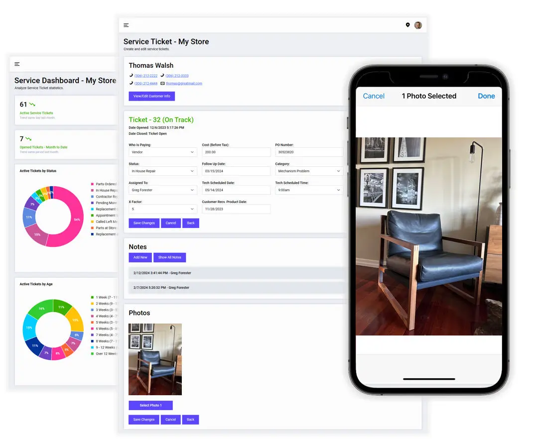 The Customer Service module displays graphs and charts to show how your customer service department is performing and helps you to identify areas of improvement. Service technicians can enter notes and photos wherever they are, using their mobile phones, so the system is always up to date and proper follow-up is completed.