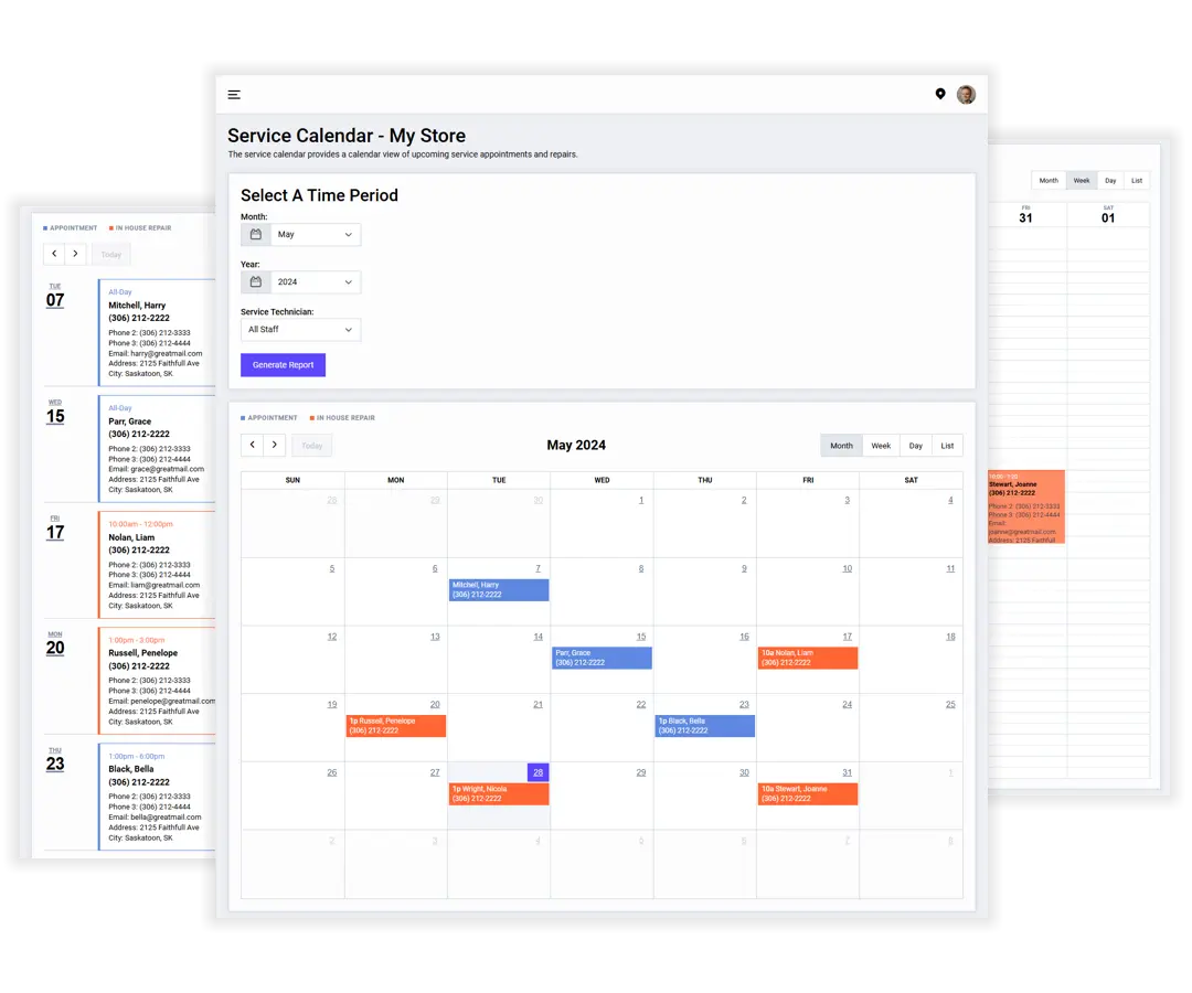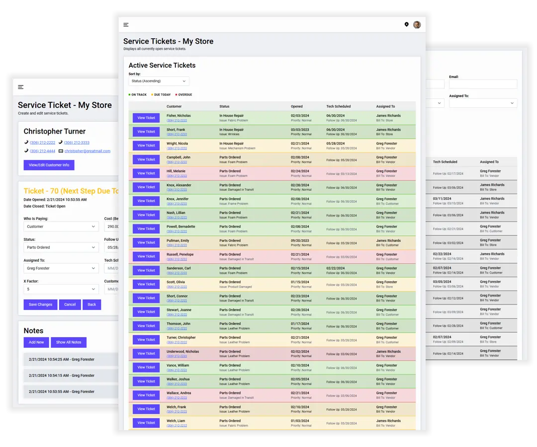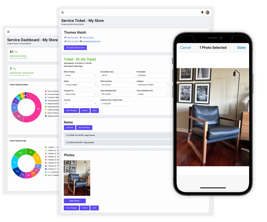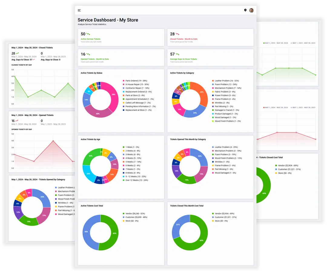 The Service Dashboard provides a graphical overview of the status of your service department, highlighting the timeliness of service provided, and the types of common or repeat service issues along with the status of each service request.
